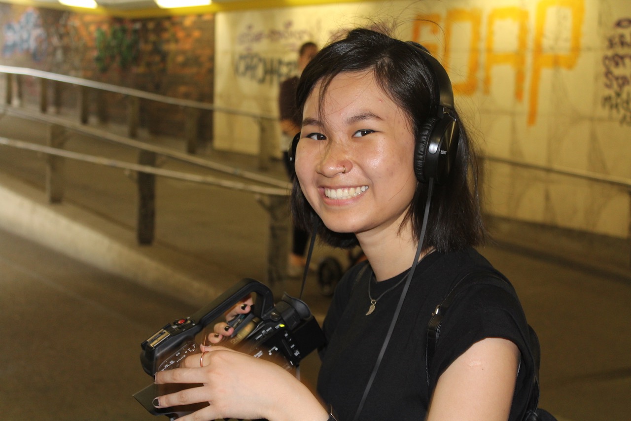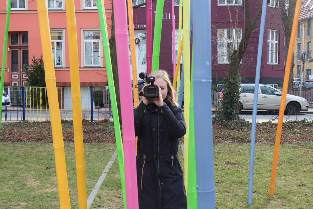 Am vierten Tag teilten wir uns wieder in zwei Gruppen – in eine, die die restlichen Orte besuchen und filmen sollte und in eine, die anfing den Film zu schneiden. Meine Gruppe gehörte zu den ersteren und zog weiter durch Rostock. Die Dreharbeiten dazu verliefen chaotisch, denn meist waren es die ungeplanten Situationen, auf die wir die Kamera richteten. Während wir also tanzten, und sangen vergaßen wir oft, dass es eine Zeitvorgabe gab und mussten dann schnell alle anderen Aufnahmen machen. Zum Abschluss des Tages probierten wir uns dann – wieder alle gemeinsam – an Instrumenten aus, mit denen wir unseren Film begleiten wollten.